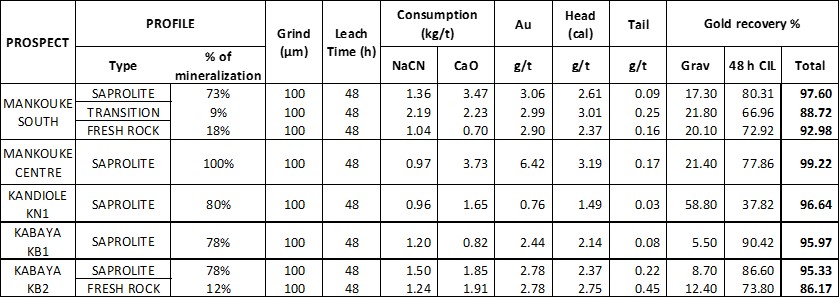 • The CIL results for the oxide zone, which carries a large proportion of the mineralization (70-80%) at Mankouke South MS1 and Center - Kandiole KN1 - Kabaya KB1- KB2, are particularly favorable with 97% total gold recovery.