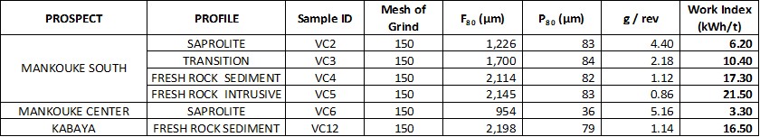 • From different metallurgical tests, in Mankouke South, the most important portion of the overall mineralization, the gravity recovery reached 27% in saprolite and 25% in transition-fresh rock.