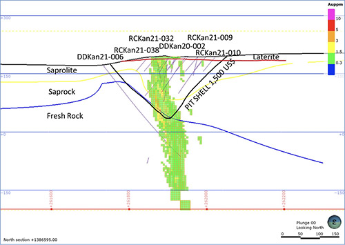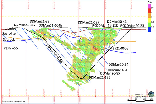 - Preliminary pit shells at Mankouke South indicate a low strip-ratio resource that is mostly oxide, with a robust starter pit of between 5.3 million tonnes at 2.2 g/t (386,000 ounces at 0.75 g.t cut-off) and 4.5 million tonnes at 2.6 g/t (377,000 ounces at 1.0 g.t cut-off)