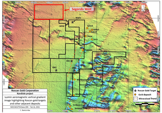 Toronto, Ontario. – February 16, 2021 – Roscan Gold Corporation (“Roscan” or the “Company”) (TSX-V: ROS; FSE:2OJ; OTC:RCGCF) is pleased to announce that the Company has strategically expanded its land package of the Kandiole Project, by acquiring the permit to the immediate North-West of the Walia and Moussala major discoveries (Figure 1). This new permit, called Segondo West is a crucial additional 42km square kilometers to the Kandiole Project, for a total land package of 346.8 square kilometers, making Roscan one the largest land holders in the area.