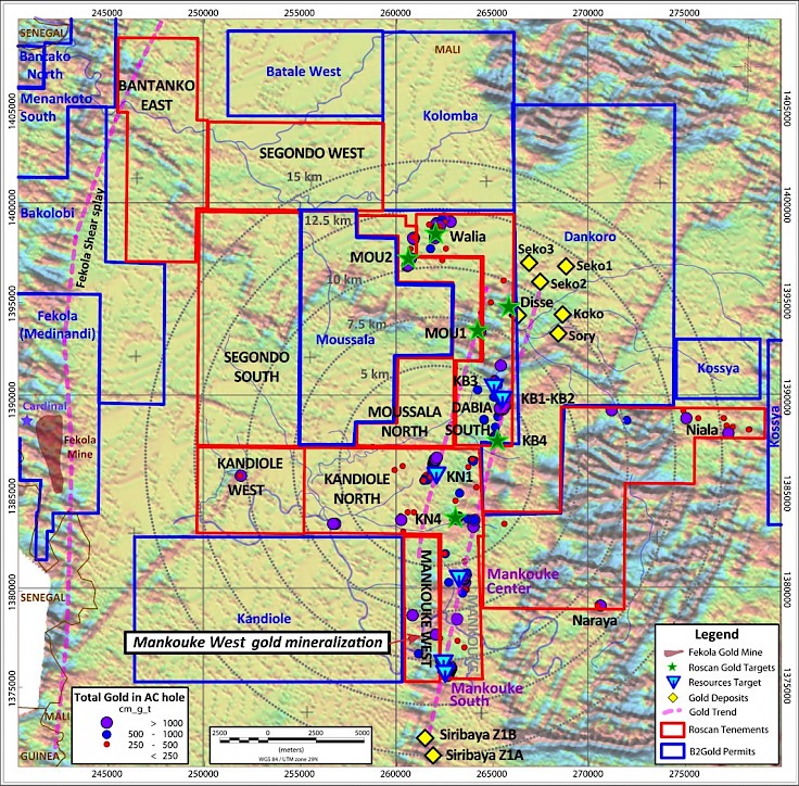 The new Mankouke West mineralization is located along an NNE-SSW portion (Figure 2) of the NE-SW regional structural corridor as shown in Roscan Airborne Geophysics survey. This corridor extends from Siribaya (IAMGOLD/MANAGEM) to Seko (B2GOLD) passing through Roscan’s land package (Mankouke South, Kandiole, Kabaya and Moussala targets) (Figure 1).