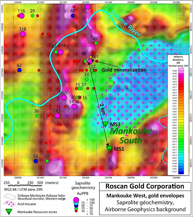 The gold mineralization at both Mankouke South and Mankouke West is located on the edge or in the vicinity of an intrusive pluton which is probably cutting the main mineralized body (MS1) with its NW extension contouring it (MS3) as shown in the Electromagnetic Airborne geophysics interpretation (Figure 2). This acid intrusive likely played a role in the hydrothermal activities, carrying gold in the more porous or brittle host rock.