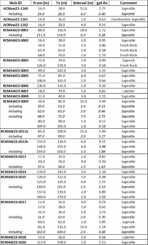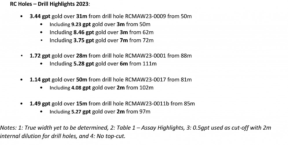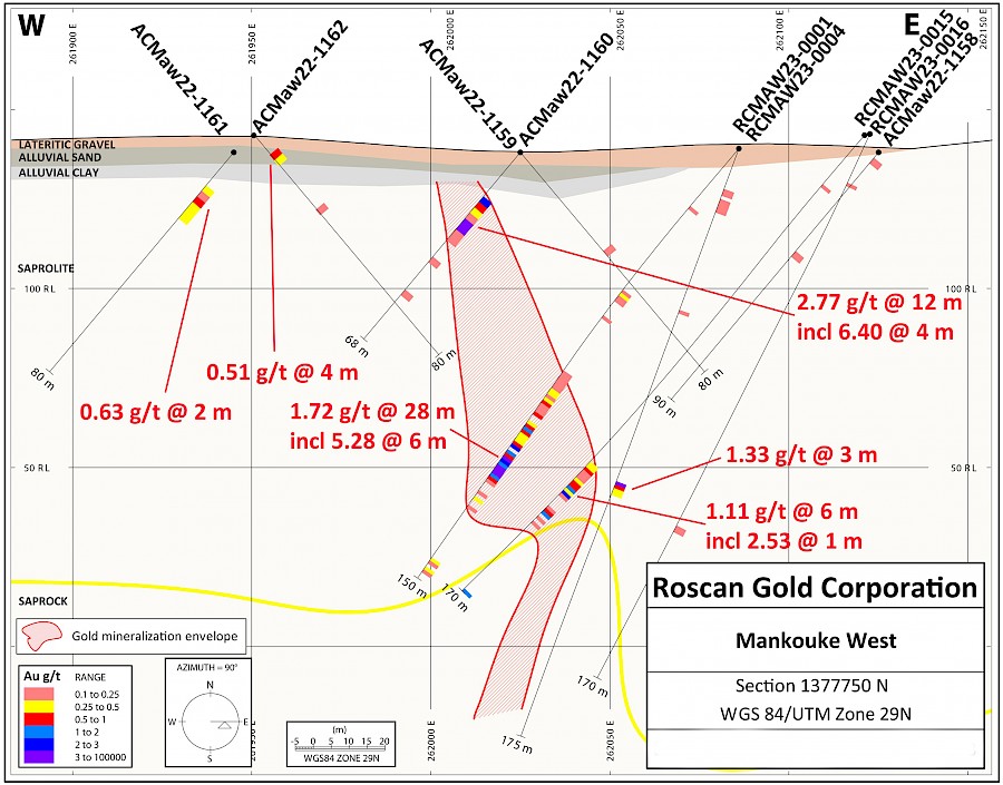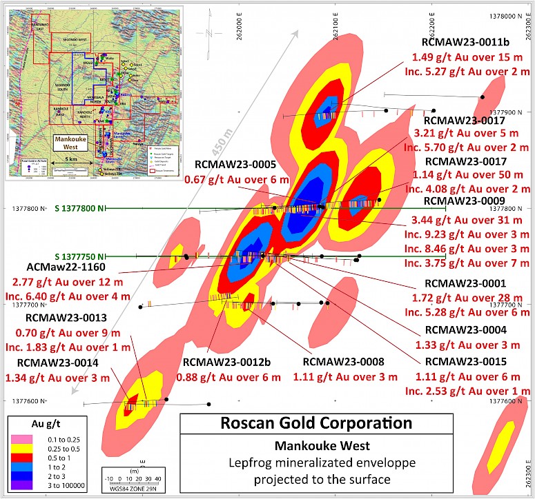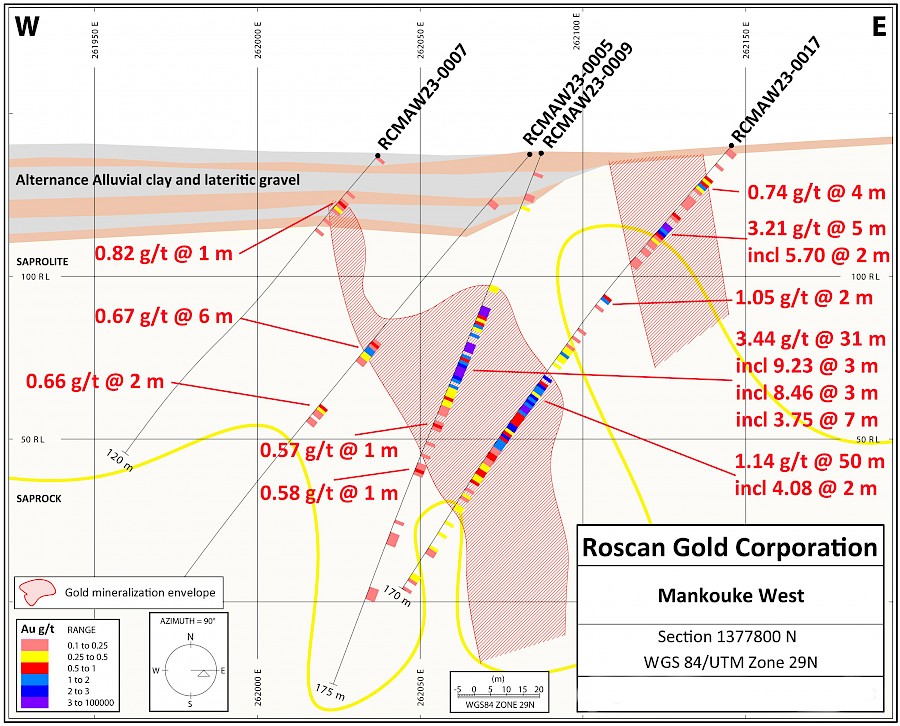 Toronto, Ontario. – September 11, 2023 – Roscan Gold Corporation (“Roscan” or the “Company”) (TSX-V: ROS; FSE:2OJ; OTCQB:RCGCF) is pleased to announce that it has identified a new high-grade zone of gold mineralization at Mankouke West (Figures 3, 4 and 5) as a result of its systematic regional exploration activities. Discovery holes include RCMAW23-0009 with 3.44 gpt over 31m, including 9.23 gpt over 3m, 8.46 gpt over 3m, 3.75 gpt over 7m, RCMAW23-0001 with 1.72 gpt over 28m, including 5.28 gpt over 6m and RCMAW23-0017 with 1.14 gpt over 50m including 4.08 gpt over 2m (Table 1).