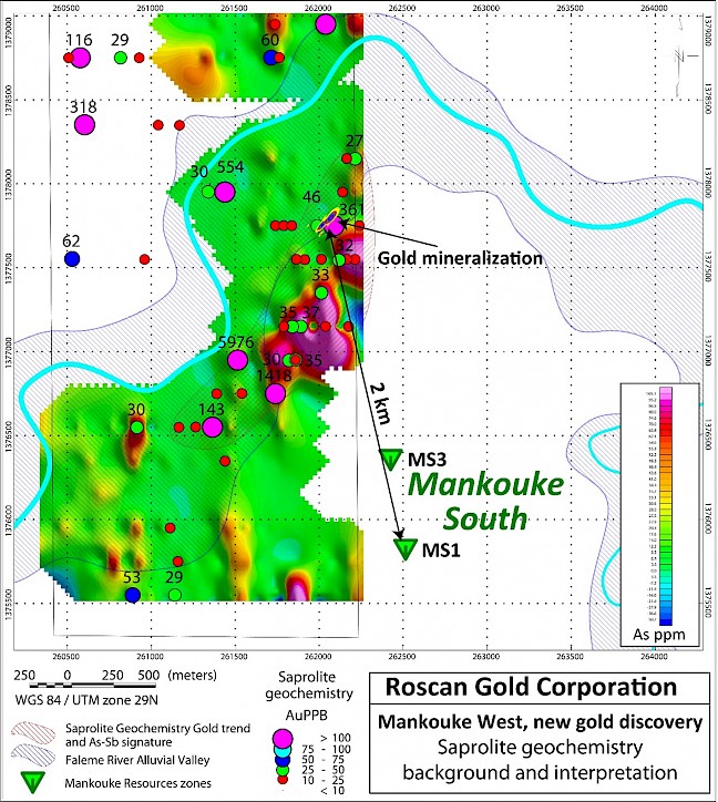 The new discovery is located 2km NW from Mankouke South, close to the area which holds over two thirds of Roscan’s maiden resource. This new zone has been traced so far over an area with a strike length of 450m, 50m wide, and 125m vertical depth, and it is open toward NE and SW and at depth. This gold occurrence lies in a large footprint of about 2km long and 500m wide outlined by saprolite geochemistry with arsenic and antimony pathfinders providing expectation for substantial extensions (Figure 6).