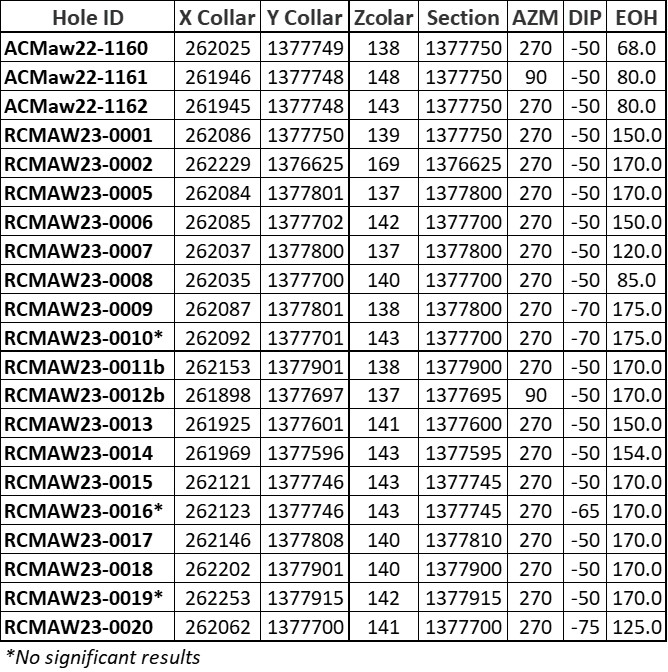 Roscan uses Geodrill Reverse Circulation (RC) to drill until maximum 170m to reach the target. In 2021, (Air Core holes ACMAW22-1158-1162), the samples were sent for preparation to Bureau Veritas’ Bamako laboratory and 1 kg Bottle Roll with atomic absorption finish analysed in BV lab, Abidjan. Since January 2022, the samples are sent to the ALS Laboratories in Bamako, Mali and assayed at their analytical facilities in Ouagadougou for 2 kg Bottle Roll with atomic absorption finish including tail analysis by fire assays for results more than 0.05ppm. Roscan applied industry-standard QA/QC procedures to the program using reference materials, blanks, standards, and duplicates.