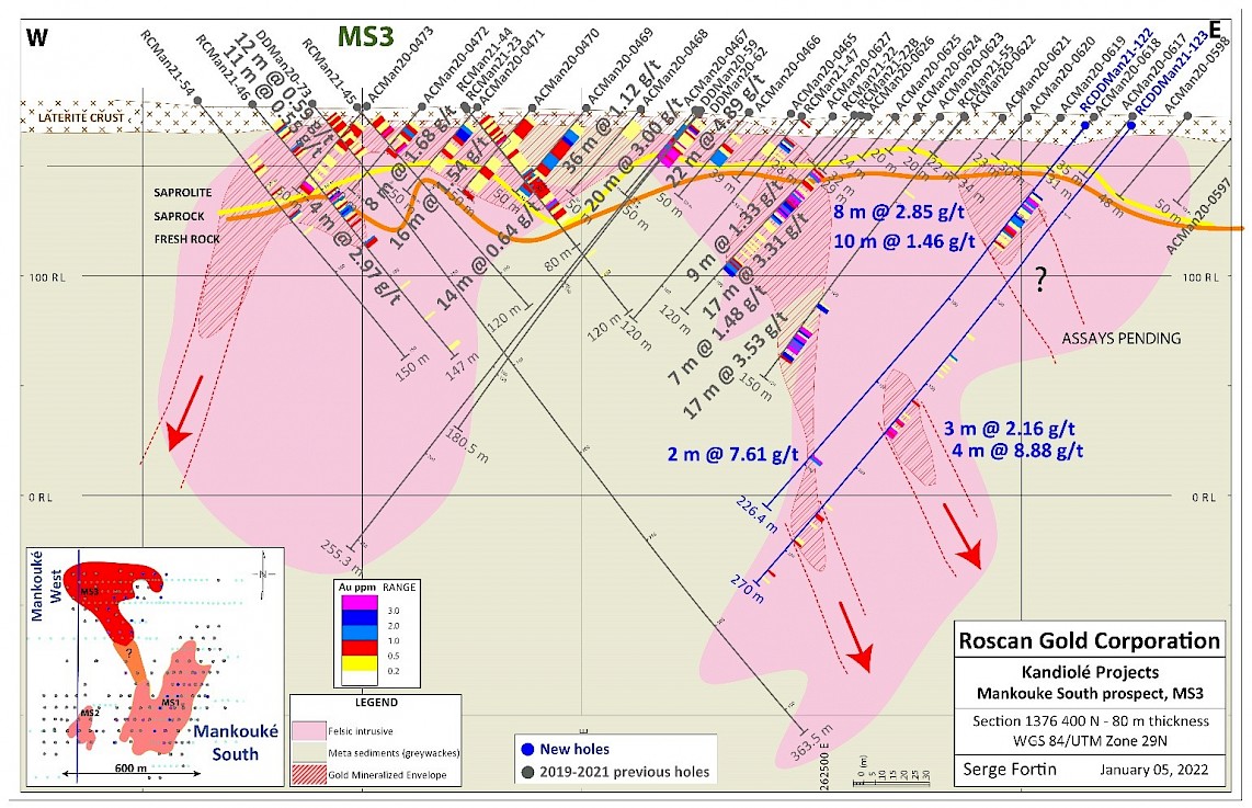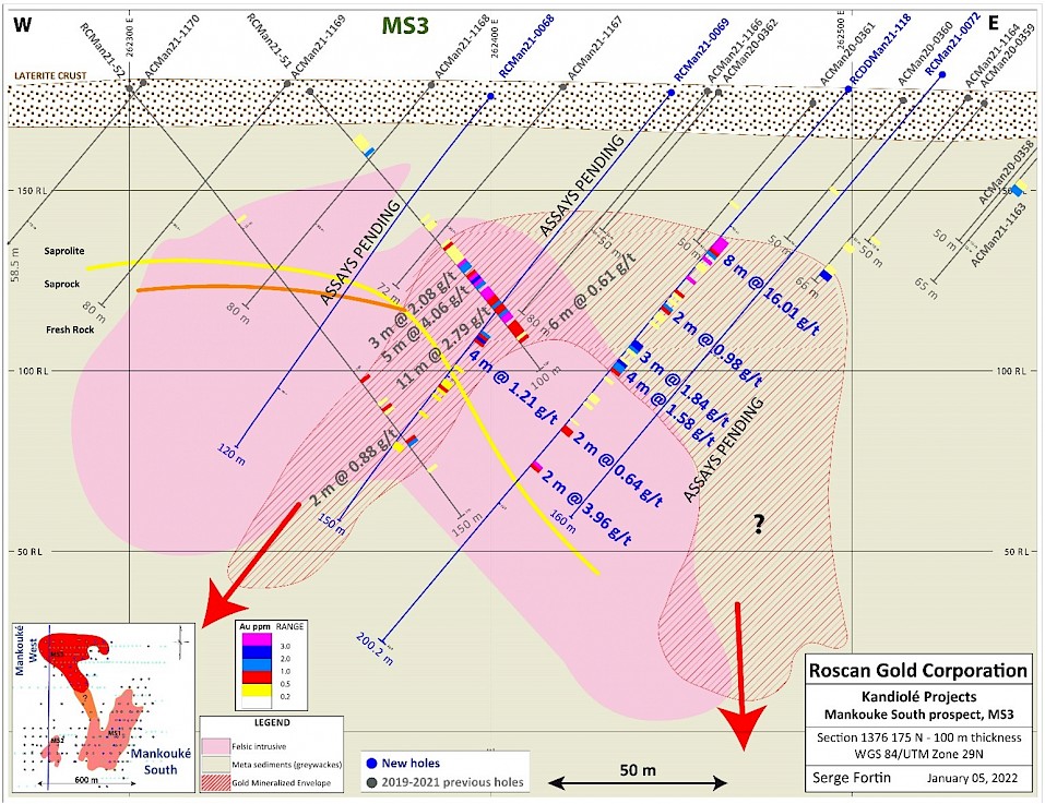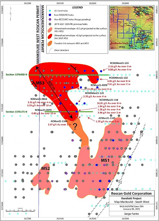 Toronto, Ontario. – January 10, 2022 – Roscan Gold Corporation (“Roscan” or the “Company”) (TSX-V: ROS; FSE:2OJ; OTCQB:RCGCF) is pleased to announce positive results (Figure 1) from an additional 2 Air Core (AC) and 14 Reverse Circulation (“RC”) and Diamond Drilling (“DD”) holes totaling 2,456 meters (m) at our Southern Mankouke Zone (MS3 targets). MS3 shows potential of a high-grade extension to the East and South, open at depth and to the North and South.