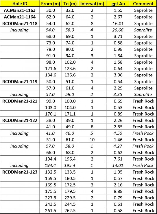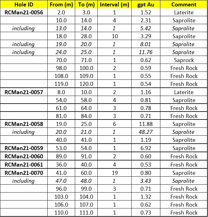 Table 2: RC hole Highlights at Mankouke MS3 – partial results (January 10, 2022)