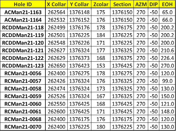 - 11.88 gpt gold over 6 m from drill hole RCMan21-0058 from 19m