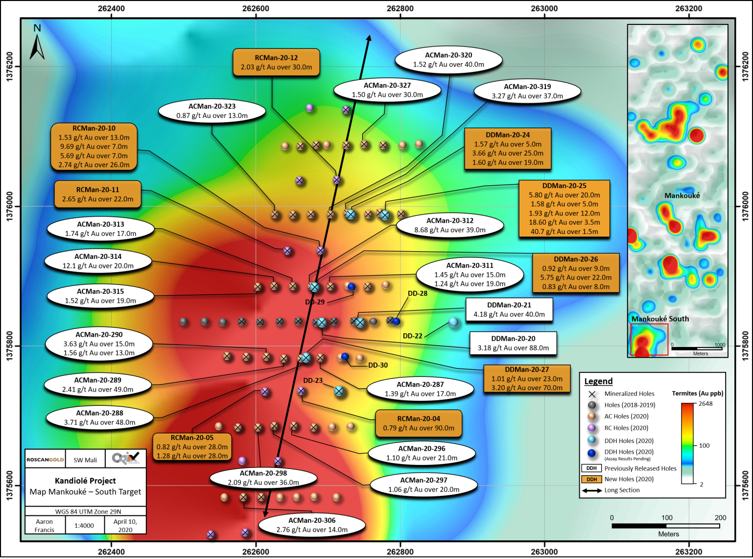 Toronto, Ontario. – April 13th, 2020 – Roscan Gold Corporation (“Roscan” or the “Company”) (TSX-V: ROS; FSE:2OJ) is pleased to confirm depth continuity in mineralization and positive DDH and RC drill results (Figure 1) from an additional 20 holes totaling 2,315 metres (m) at its Mankouke South Target, and AC drilling has begun at Kandiole West with the arrival of the second drill.