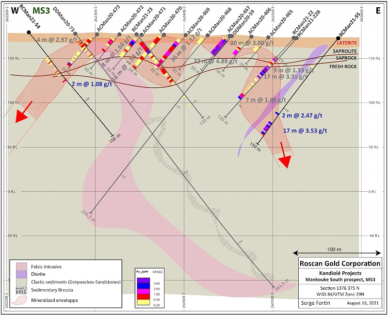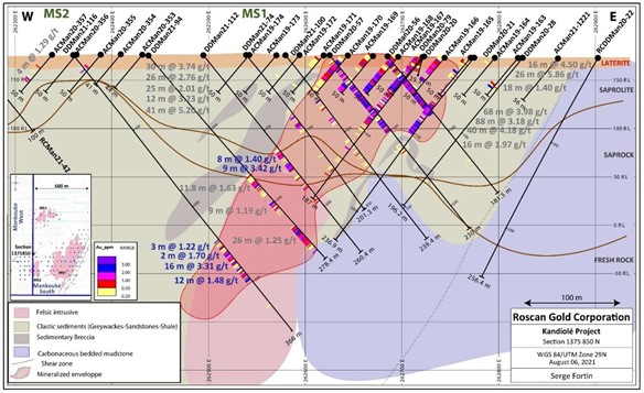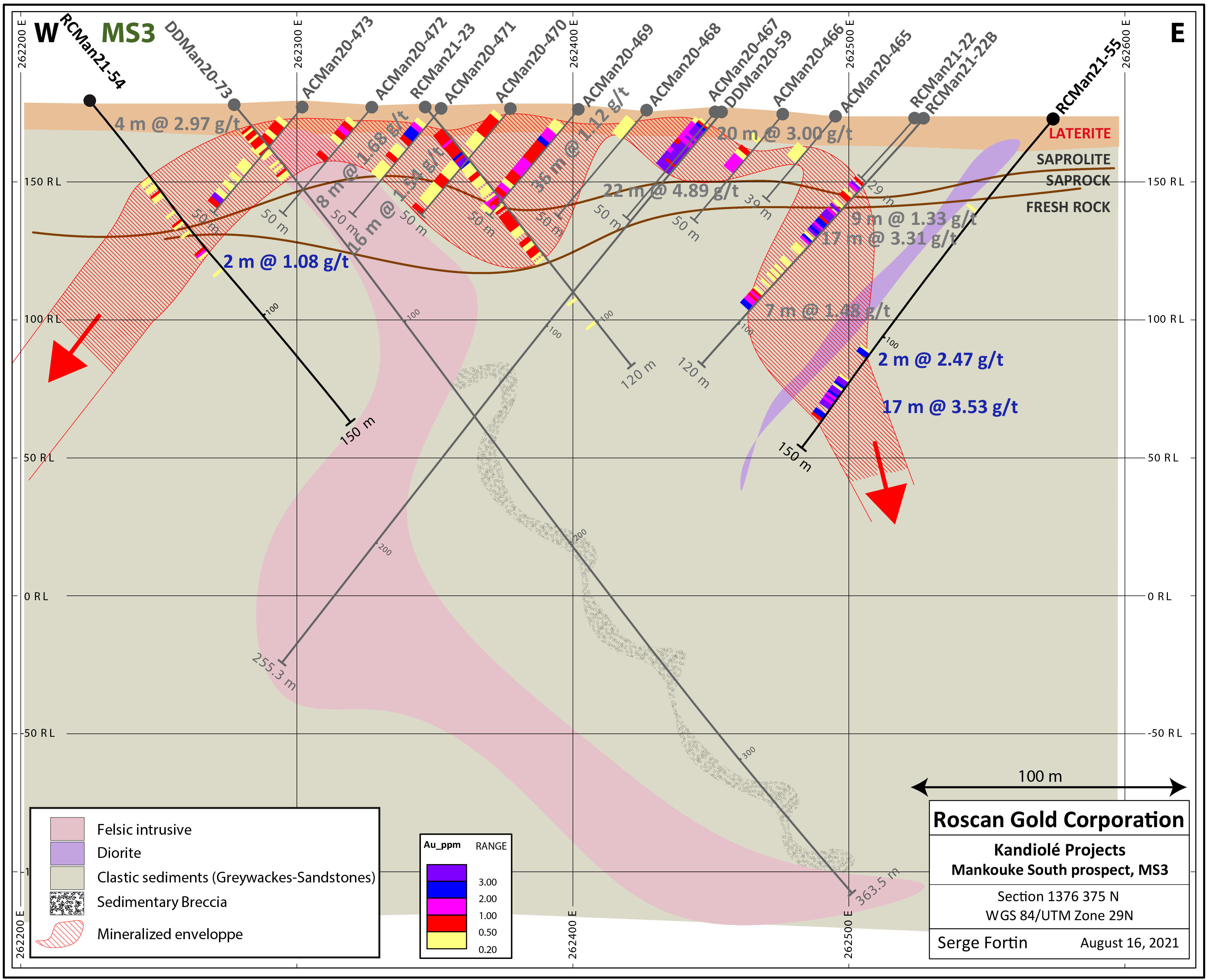 Toronto, Ontario. – August 17, 2021 – Roscan Gold Corporation (“Roscan” or the “Company”) (TSX-V: ROS; FSE:2OJ; OTC:RCGCF) is pleased to announce positive results (Figure 1) from an additional 17 DD and RC holes totaling 2,956 meters (m) at our Southern Mankouke Zone (MS1 and MS3).