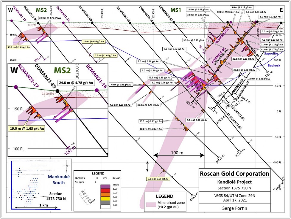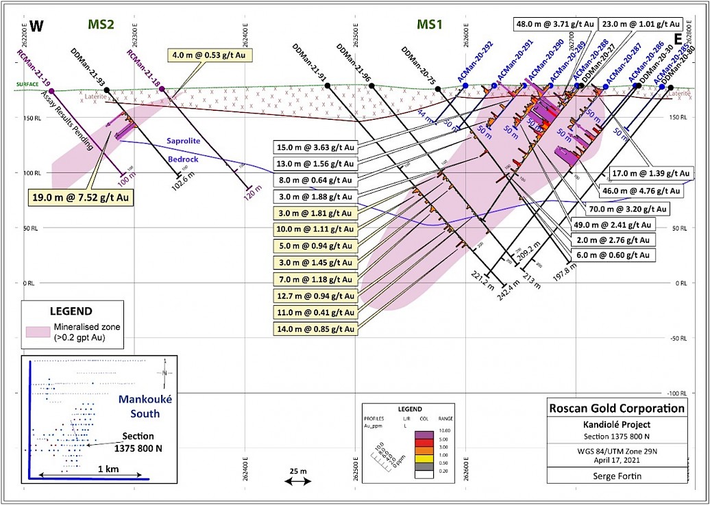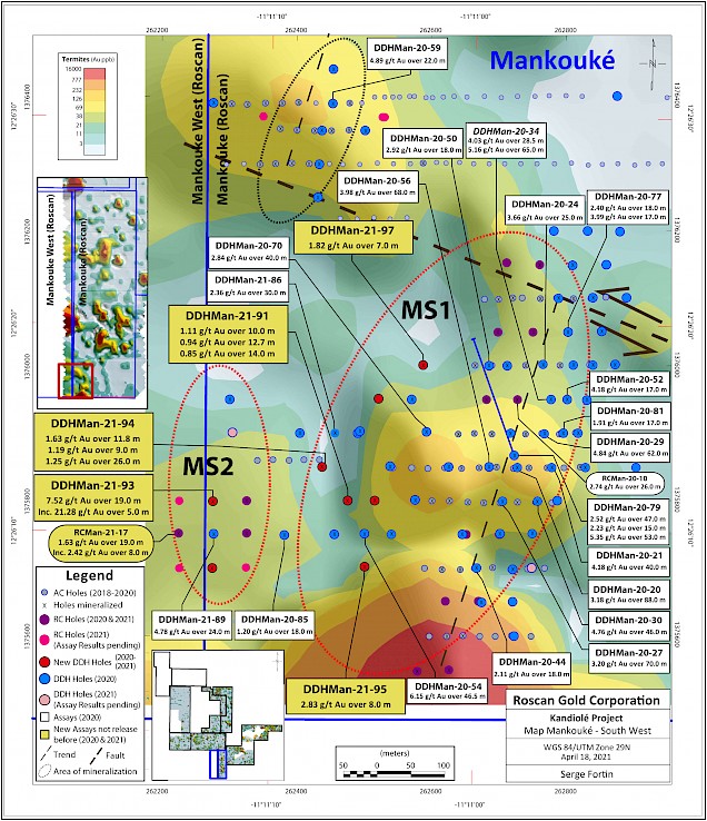 Toronto, Ontario. – April 19, 2021 – Roscan Gold Corporation (“Roscan” or the “Company”) (TSX-V: ROS; FSE:2OJ; OTC:RCGCF) is pleased to announce positive Diamond and RC drill results (Figure 1) from an additional 12 holes totaling 2,205 meters (m) at our Southern Mankouke Zone (MS1 and MS2).