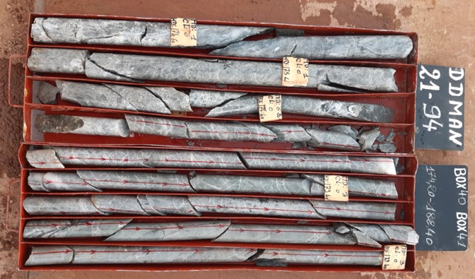 Figure 6: Drill Core Photo DDMan21-94 showing broadly high-grade Sections in Fresh Rock at MS1