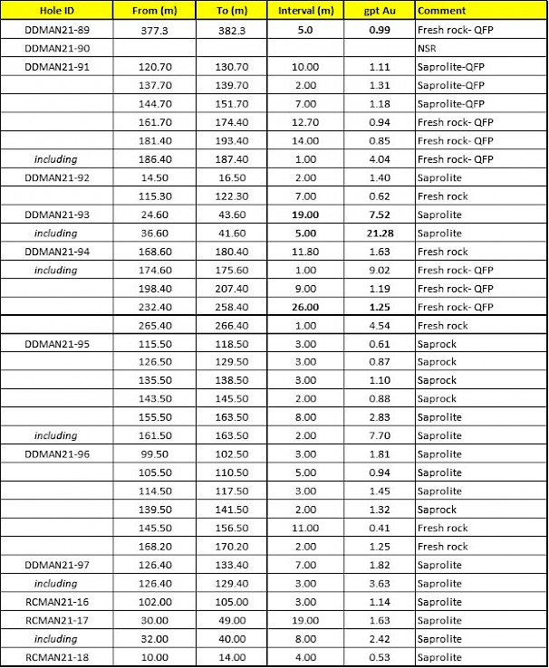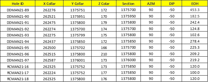 • 7.52 gpt gold over 19m from drill hole DDMAN21-93 from 24.6m