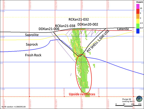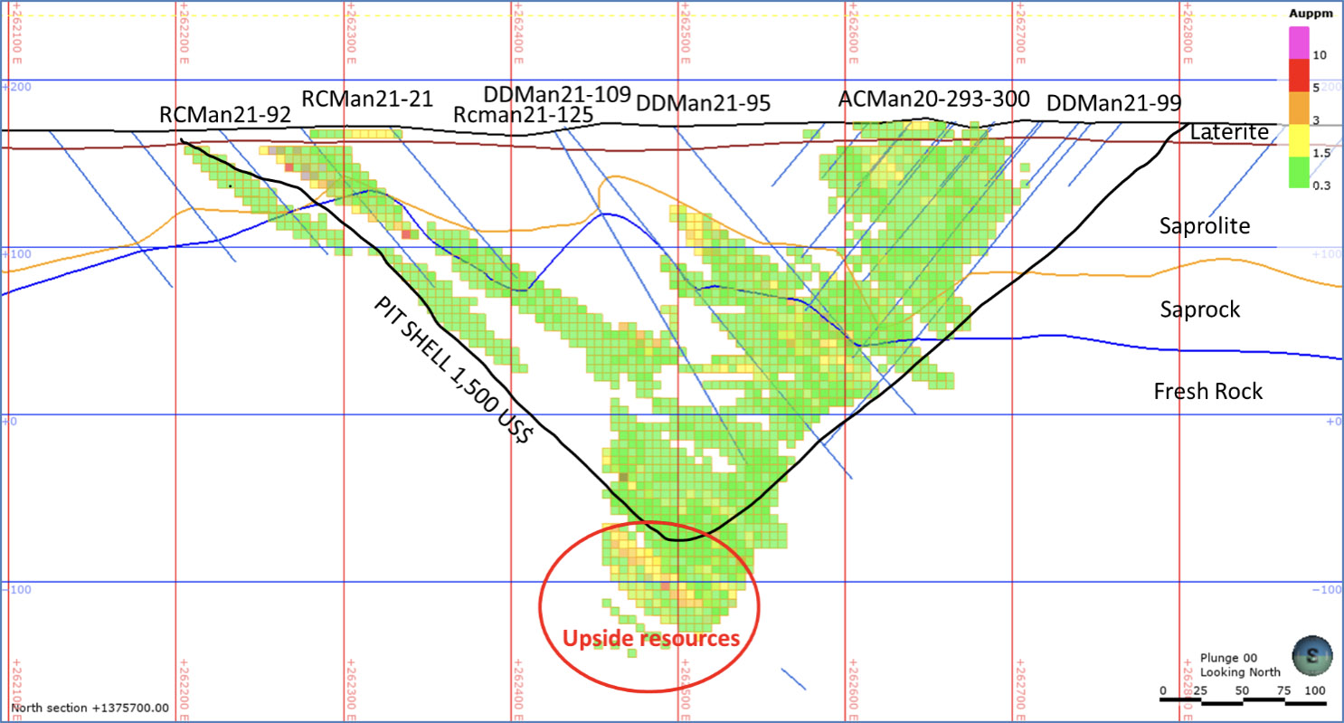 In section below, additional ounces are expected in the Mankouke MS1, under the resource 1,500 USD pit shell (Figure 1). The hole DDMan21-104b on this section has already returned 2.02 g/t over 25 meters from 329.3 m (Roscan Press Release July 6, 2021). Infill drilling on this area is underway with 4 DD holes, totalizing 1,350 m.