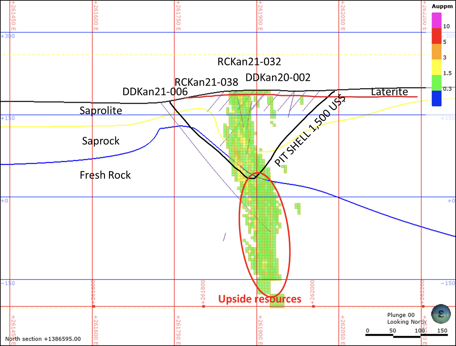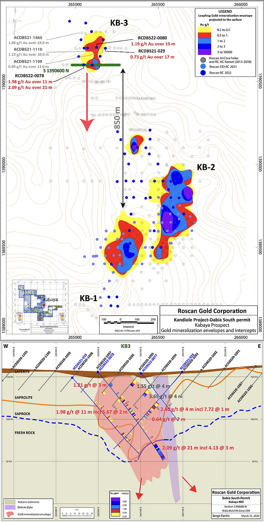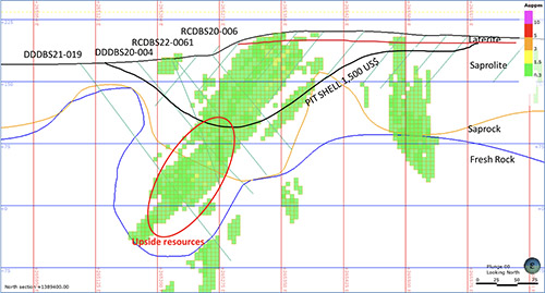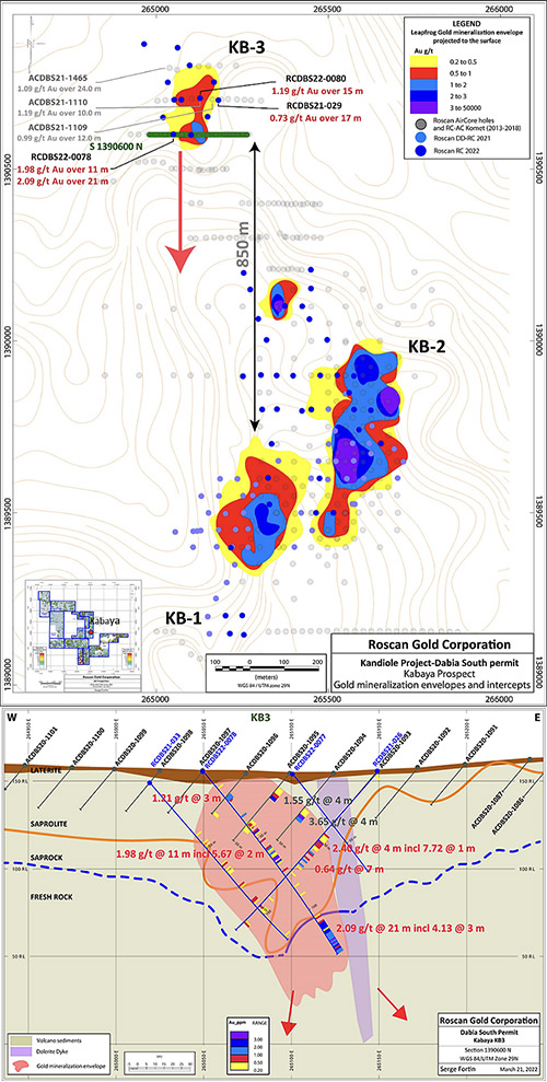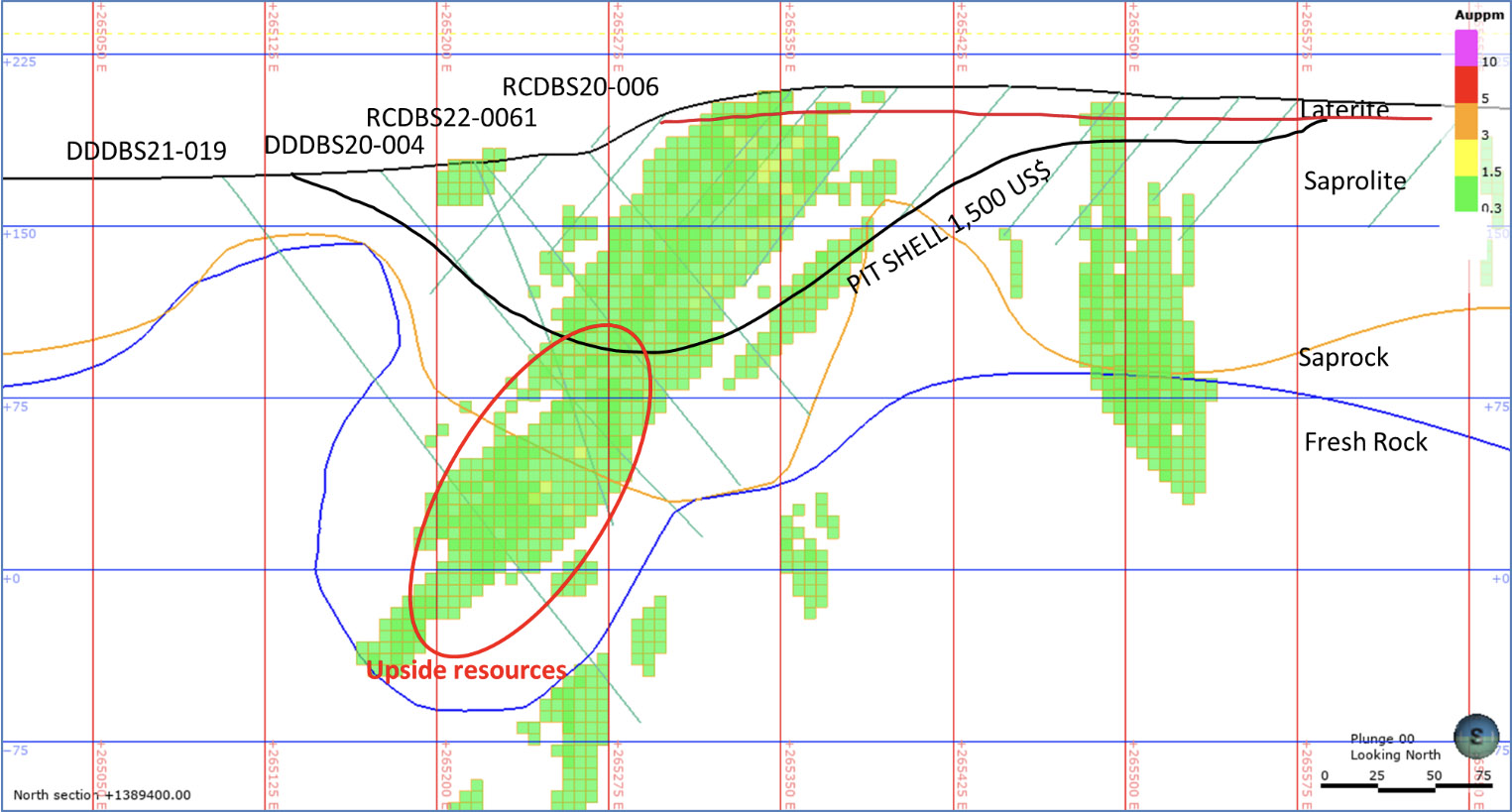 The Kabaya ongoing drilling program with 20 RC holes for 3,200 m is focused below the 1,500 USD pit shell (Figure 2), where previous drilling outside the MRE has already returned 1.46 g/t over 31 m from drill hole RCDBS22-0061 from 117m (Roscan Press Release March 23rd, 2022). The gold mineralization expected is outside the current resource estimate and the block model is already interpolated.