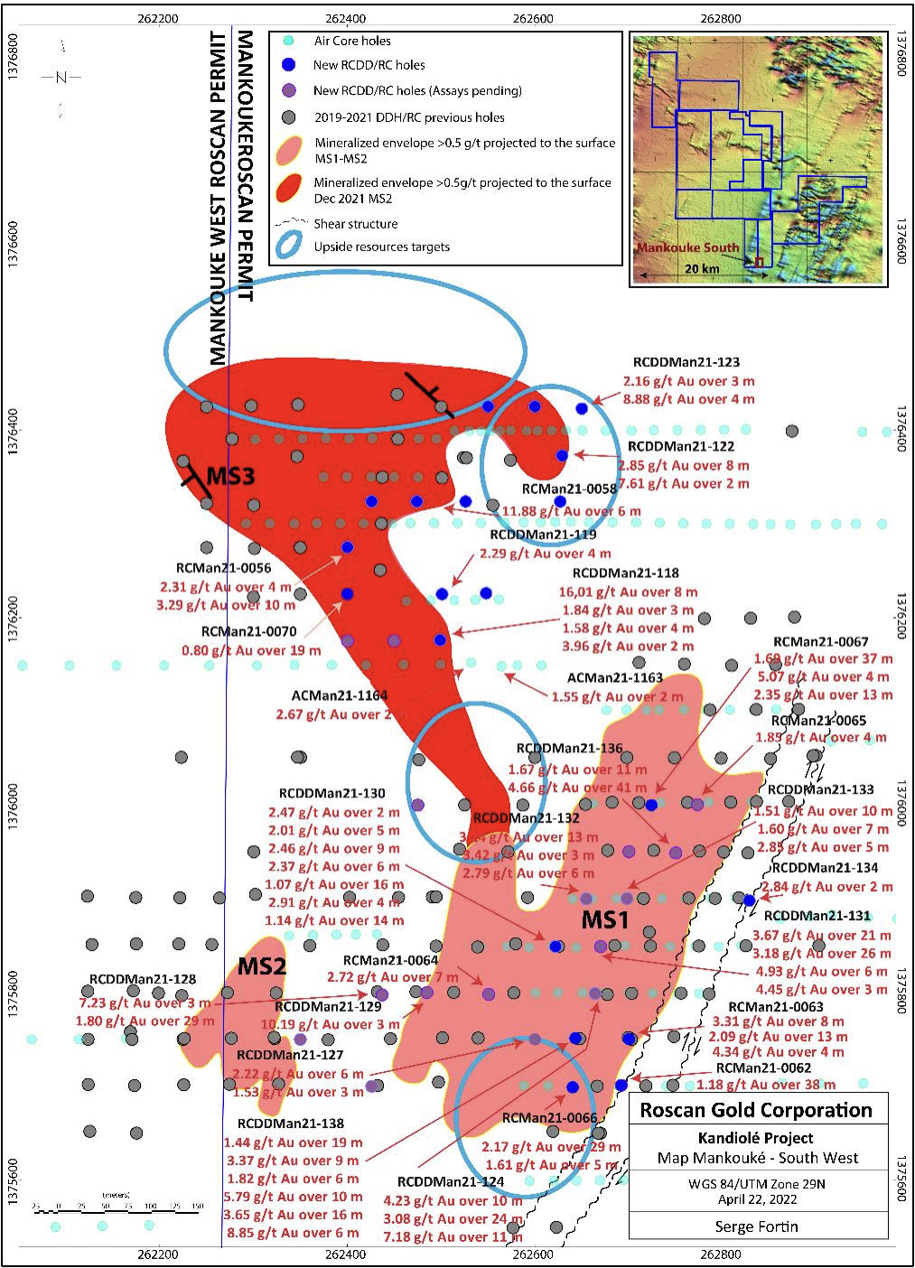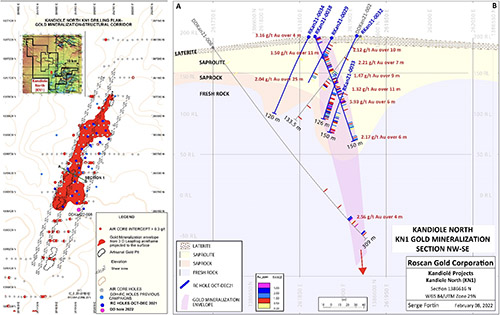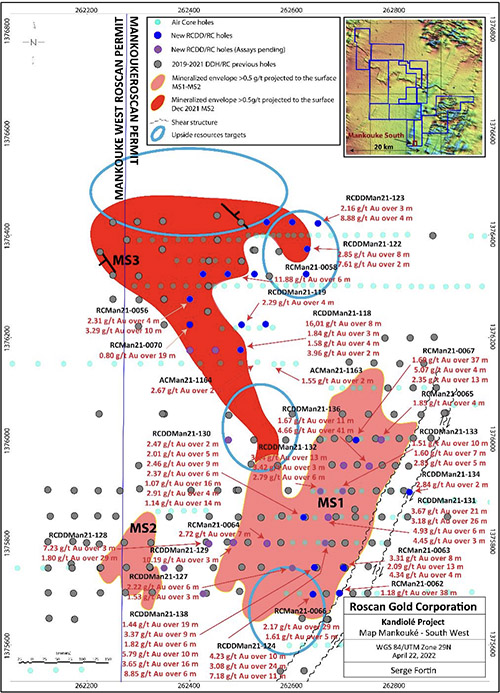 In Mankouke West, the pending saprolite gold results from the Air Core fence lines (84 holes 5,620 m) should provide a good indication to define mineralization not far from the Mankouke South resource area. Several other targets on the large Roscan land package, both on the main Siribaya-Mankouke-Seko structural corridor, as well as additional targets off this key corridor, remain to be explored at different levels, from grassroots stage to development targets.