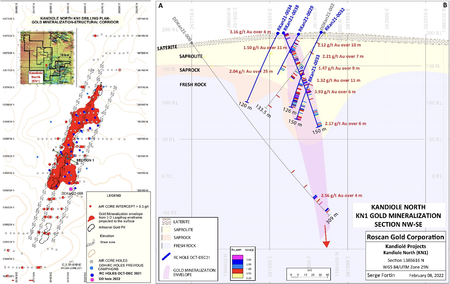 At Disse, the high grade (7.29 g/t over 6 m from drill hole RCDBS21-0049 – Roscan Press Release February 23rd, 2022) gold mineralization continues to be explored with possible expansion toward the West.